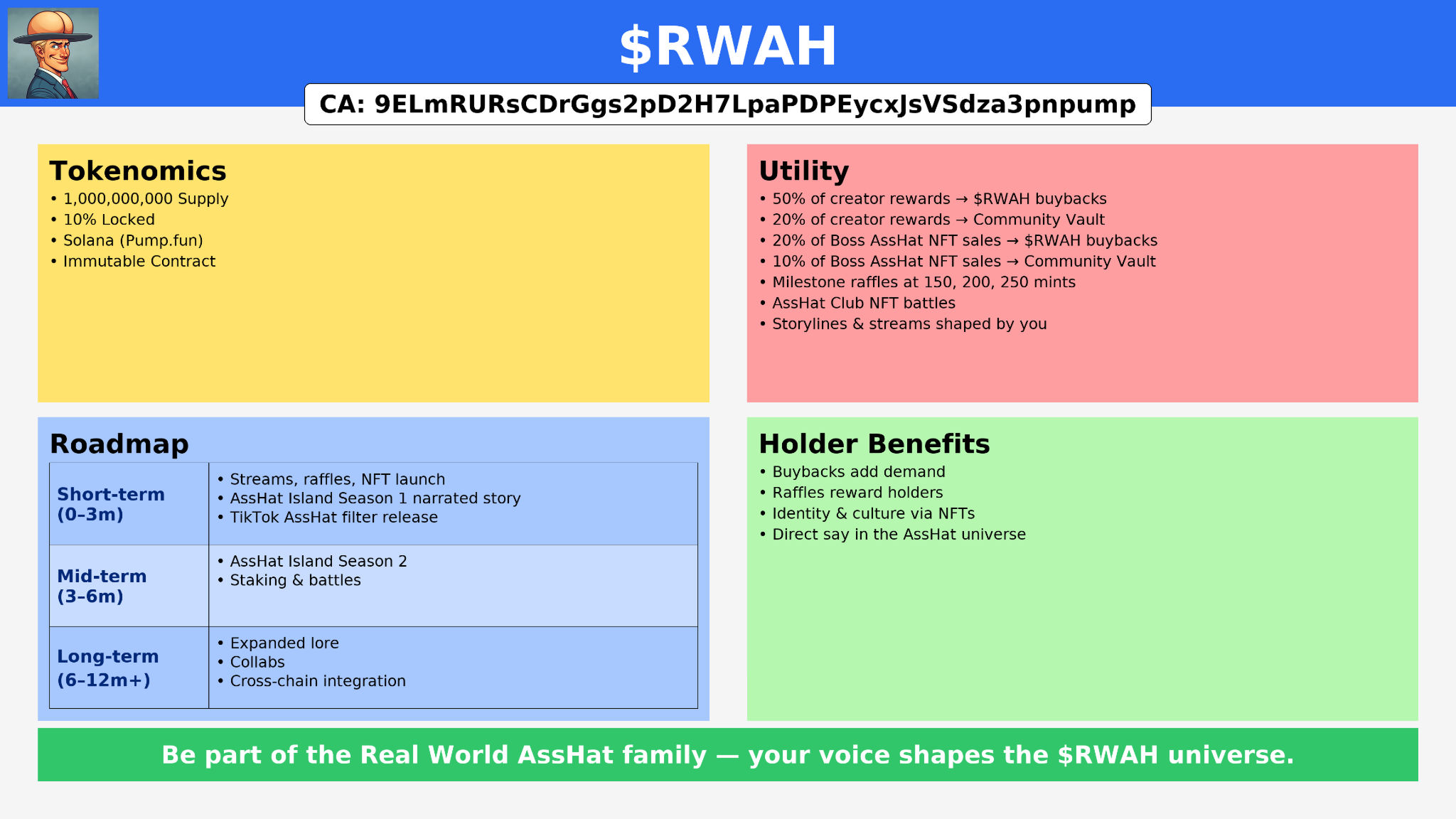 $RWAH is a Solana-based token launched via Pump.fun that blends memes, NFTs, and interactive storytelling into one global community movement.